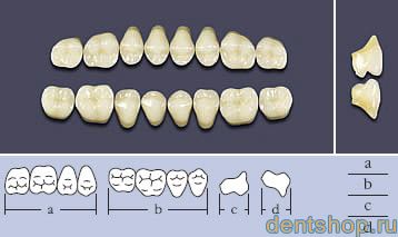 Зубы искусственные гарнитурные трехслойные акриловые.